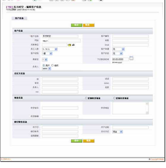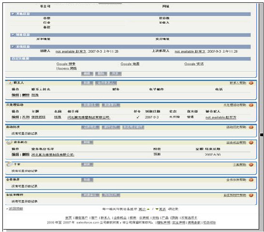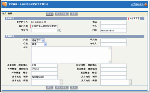 易客采用的窗口切換方式類似于Salesforce,在Ajax大行其道的今天,不能不說這種方式的落后。不過令人欣慰的是,易客在客戶信息被保存后,修改個(gè)別字段時(shí)大量運(yùn)用了Ajax技術(shù),十分方便。這部分細(xì)節(jié)我們放在維護(hù)客戶部分描述。