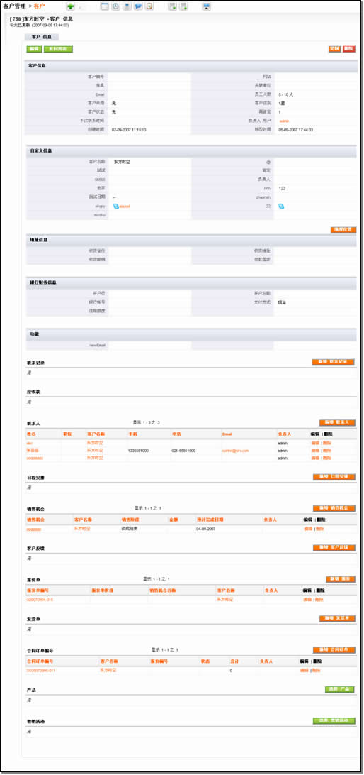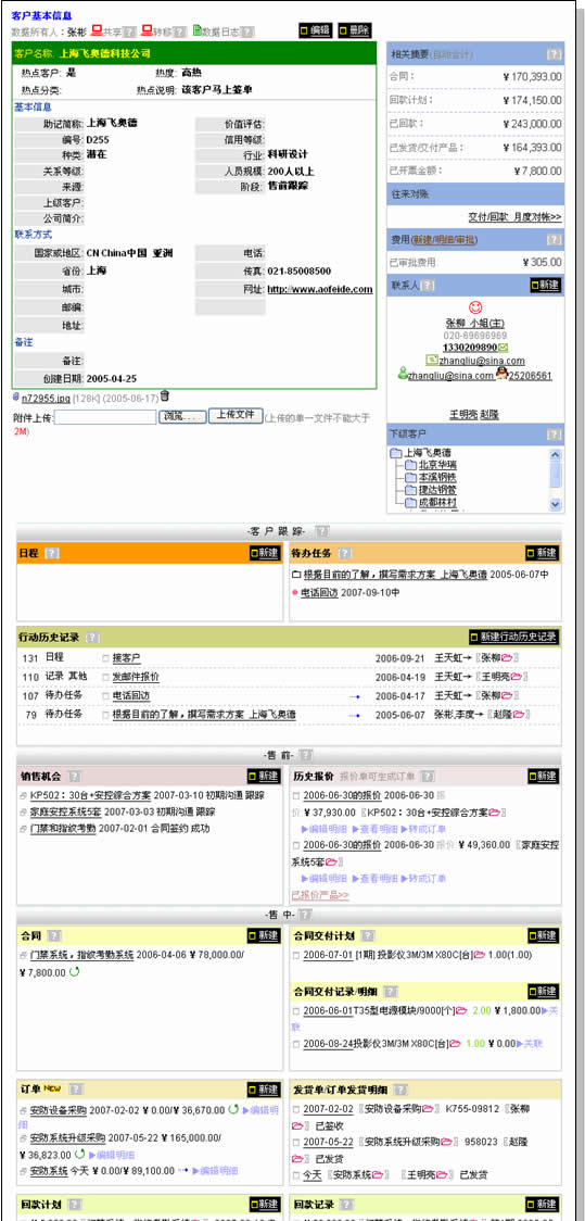 從其視圖的內(nèi)容結(jié)構(gòu)上,分為客戶基本信息、統(tǒng)計(jì)信息、聯(lián)系人;跟蹤;售前(銷售機(jī)會(huì)、報(bào)價(jià));售中(合同、訂單、回款發(fā)票);售后(服務(wù)投訴)。應(yīng)該說比較完整地涵蓋了客戶跟蹤和維護(hù)的全部過程。