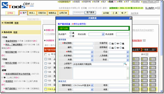 XToolsCRM的快速新建客戶頗有些新意,從操作上看,它突破了關(guān)系型數(shù)據(jù)庫(kù)中客戶和聯(lián)系人表分離的制約,同時(shí)保存兩表數(shù)據(jù),很方便。