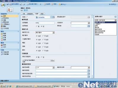 Dynamics CRM同時也提供了網(wǎng)頁瀏覽器版本的操作者接口。實際操作網(wǎng)頁版的Dynamics CRM后,我們發(fā)現(xiàn)雖然這種方式不像Outlook可以使用本身的日程表、收發(fā)私人郵件,但是操作上,網(wǎng)頁版本因為沒有其它多余選項而顯得更清爽。它的接口與Outlook十分接近,同樣將選擇項目設(shè)置在左下方,并且在點選出行日歷時,一樣會帶有日期跳動至今天的動態(tài)效果。除了沒有“在CRM中追蹤”與可以“離線”使用之外,其余功能都具備。