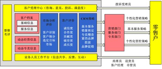 煙草行業(yè)的CRM項目是建立在煙草行業(yè)獨特的業(yè)務(wù)流程和特點之上的。在煙草行業(yè),CRM系統(tǒng)往往并不是作為一個獨立的系統(tǒng)存在,而是要與營銷系統(tǒng)、專賣系統(tǒng)等緊密聯(lián)系,形成相互共享資源的一個整體。因此,煙草行業(yè)CRM業(yè)務(wù)模型(如圖)要根據(jù)企業(yè)的經(jīng)營目標、任務(wù)、市場管理的工作需要,為營銷、服務(wù)和專賣等部門制定營銷策略、服務(wù)策略和管控策略。