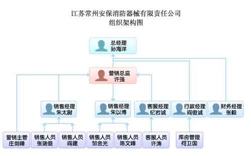百會CRM模擬了“江蘇常州安保消防器械有限責任公司”的組織架構,設置了一套專門針對產(chǎn)品銷售型、生產(chǎn)制造型企業(yè)的CRM系統(tǒng),對CRM系統(tǒng)所提供的模塊和不同職位的人員所具備的權限都進行了界定,這樣一套系統(tǒng)就足夠以銷售和生產(chǎn)制造為主的公司進行使用。該公司的具體組織架構見下圖。