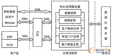 包括ERP、SCM等其他企業(yè)應(yīng)用在內(nèi)的所有的系統(tǒng)用戶與應(yīng)用功能層的數(shù)據(jù)交換均通過XMI數(shù)據(jù)進(jìn)行傳輸,從而大大減小了各種企業(yè)應(yīng)用系統(tǒng)間的通信阻力,為EAI提供了良好的通信平臺(tái)。Web用戶的客戶端只是“瘦小的”瀏覽器日_數(shù)量不受限制,不需要安裝專門的軟件,這使得凡可以接入Internet的用戶都可以方便、靈活地使用系統(tǒng),大大提升了系統(tǒng)用戶間溝通、協(xié)作的效率。此外,由于CRM應(yīng)用系統(tǒng)是在中央服務(wù)器上實(shí)施和維護(hù)的,對客戶端的要求遠(yuǎn)沒有C/S結(jié)構(gòu)那么高,集中的軟件實(shí)施和維護(hù)大大節(jié)約了企業(yè)的運(yùn)行成本和維護(hù)費(fèi)用。圖1描述的是筆者所要闡述的適應(yīng)網(wǎng)絡(luò)環(huán)境的基于Web的系統(tǒng)平臺(tái)架構(gòu),這并不意味著CRM應(yīng)用系統(tǒng)完全以這種方式運(yùn)行,事實(shí)上用戶接入CRM系統(tǒng)的方式是多種多樣的,系統(tǒng)還應(yīng)該提供電話、傳真、無線接入等多種接入接口。