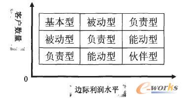 這5種類型之間并不具有簡單的優(yōu)劣對比或順序,因為企業(yè)所采用的客戶關(guān)系類型取決它的產(chǎn)品以及客戶的特征,不同企業(yè)甚至同一企業(yè)在對待不同客戶時,都有可能采用不同的客戶類型。一家生產(chǎn)日用化妝品的企業(yè),與它的化妝品消費者個人之間常會建立一種被動型的客戶關(guān)系,企業(yè)設(shè)立的客戶服務(wù)機構(gòu)或聯(lián)絡(luò)中心將聽取客戶的意見,處理客戶投訴以及改進(jìn)產(chǎn)品;但這家企業(yè)同大型超市或零售企業(yè),同連鎖的美容產(chǎn)業(yè)機構(gòu)之間,?赡芙⒁环N伙伴型的客戶關(guān)系,實現(xiàn)產(chǎn)銷企業(yè)之間的互惠互利?铺乩仗岢,企業(yè)可以根據(jù)其客戶的數(shù)量以及產(chǎn)品的邊際利潤水平,根據(jù)圖3指示的思路,選擇合適的客戶關(guān)系類型。
