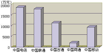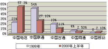 通過引入IP電話業(yè)務(wù),我國電信市場已經(jīng)形成了以中國電信、中國聯(lián)通、中國移動(dòng)、中國吉通和中國網(wǎng)通等五大電信運(yùn)營公司為主體的新格局。他們各自的業(yè)務(wù)范圍不盡相同,但I(xiàn)P電話是他們相同的業(yè)務(wù)之一,所以這一市場相互之間的競爭較為激烈。圖1和圖2分別表示這五大運(yùn)營商在2000年上半年IP電話的話務(wù)量和收入。從圖中可以看出,他們在我國IP電話市場上所占據(jù)的地位和角色。