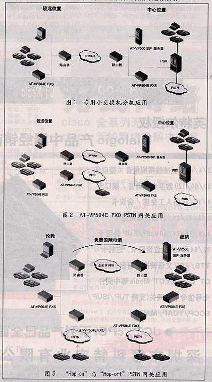 在圖2所示的應(yīng)用中,遠(yuǎn)程局位置直接附加了一個(gè)AT-VP504E FXO裝置,為PSTN提供IP電話網(wǎng)關(guān)服務(wù),IP語(yǔ)音呼叫被轉(zhuǎn)化為模擬格式通過(guò)標(biāo)準(zhǔn)電話線路進(jìn)行傳輸。同樣,來(lái)自普通電話網(wǎng)絡(luò)的呼入呼叫,也被轉(zhuǎn)化為IP呼叫通過(guò)企業(yè)IP網(wǎng)絡(luò)轉(zhuǎn)接。這就使本地PSTN呼叫者,可向企業(yè)或其他目的地打免費(fèi)長(zhǎng)途電話。