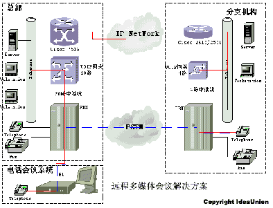 圖中紅色實線表示通過IP網絡傳輸語音的線路,藍色虛線表示通過PSTN傳輸語音的線路。由于通過IP網絡沒有使用額外的長途線路,所以降低了遠程會議系統(tǒng)的運行成本。同時VoIP傳輸系統(tǒng)支持普通的長途電話呼叫,為客戶節(jié)省長途電話開支。