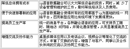 人們常常認(rèn)為語音數(shù)據(jù)融合帶來的明顯優(yōu)勢(shì)只是成本下降,其實(shí),事實(shí)遠(yuǎn)不止如此,語音、視頻、數(shù)據(jù)統(tǒng)一傳輸?shù)男录夹g(shù)必然帶來許多新的網(wǎng)絡(luò)應(yīng)用和解決方案。這些創(chuàng)新的多媒體解決方案可以開發(fā)成供應(yīng)鏈管理、電子商務(wù)、客戶服務(wù)、生產(chǎn)效率、電子教學(xué)當(dāng)中的應(yīng)用,幫助企業(yè)將傳統(tǒng)業(yè)務(wù)處理和國(guó)際互聯(lián)網(wǎng)結(jié)合起來,形成一種嶄新的經(jīng)濟(jì)模式。其作用是將信息流遍布整個(gè)企業(yè)的銷售、研發(fā)、管理、服務(wù)等各個(gè)流程。對(duì)內(nèi)加快信息流通,加強(qiáng)員工、生產(chǎn)的管理,提高運(yùn)作效率。對(duì)外提供優(yōu)良的客戶服務(wù),統(tǒng)一供應(yīng)鏈,從而在競(jìng)爭(zhēng)中脫穎而出。