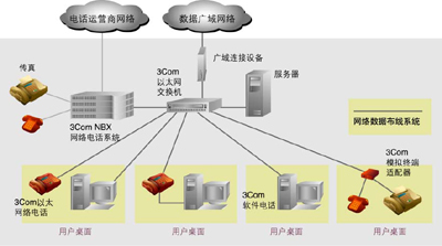 SuperStack 3 NBX V5000交換系統(tǒng)作為網(wǎng)絡(luò)話音核心交換系統(tǒng),該系統(tǒng)內(nèi)置了自動(dòng)話務(wù)員、語(yǔ)音消息系統(tǒng)等。而桌面則采用3Com 10/100Mbps以太網(wǎng)絡(luò)電話終端,同時(shí)采用3Com