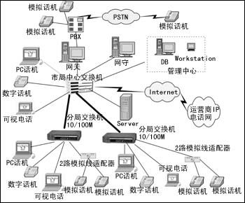 首信的IP-PBX解決方案如圖所示。以某局為例,市局與各分局之間已有寬帶網(wǎng),充分利用此帶寬以數(shù)字電話形式開展語音業(yè)務(wù)。數(shù)字電話的實(shí)現(xiàn)形式有:PC話機(jī)、數(shù)字話機(jī)、可視電話、通過模擬線適配器接入的模擬話機(jī),數(shù)字電話設(shè)備直接通過Hub與以太網(wǎng)交換機(jī)相連。數(shù)字電話通過IP電話網(wǎng)關(guān)與市局中心的程控交換機(jī)PBX相連,從而與現(xiàn)有的模擬話機(jī)相通。各種數(shù)字話機(jī)與內(nèi)部模擬話機(jī)間通話,都不需要付電話費(fèi),通過PBX撥打局外面的市話或長(zhǎng)途電話時(shí),與原來的模擬電話一樣付費(fèi)。