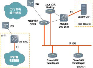 AS 5800 Dial Shelf上的E1接口直接連接客戶服務中心的Lucent公司G3R交換機。市行的語音網(wǎng)關Cisco AS 5300同樣通過高速串口接入幀中繼網(wǎng)絡,與本地網(wǎng)絡完全隔離。市行申請的95588數(shù)字中繼線路(多采用ISDN