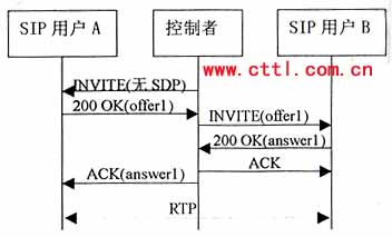 本流程中,控制者向A發(fā)送一個(gè)沒(méi)有SDP的INVITE。A應(yīng)答的200 OK響應(yīng)中包含一個(gè)offerl,控制者立即在ACK消息中產(chǎn)生一個(gè)“黑洞”SDP應(yīng)答。