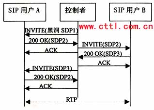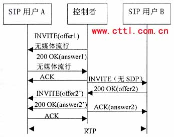 該流程中,控制者首先向用戶A發(fā)送INVITE,包含SDP1,用來(lái)創(chuàng)建一個(gè)初始的“黑洞”媒體流,A振鈴并產(chǎn)生應(yīng)答記為SDP2,其中包含的是一個(gè)有效的連接地址,但此時(shí)仍沒(méi)有媒體流向控制者?刂普呦駻發(fā)出ACK。