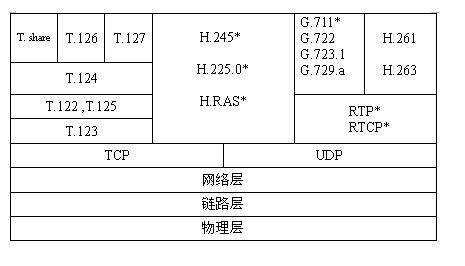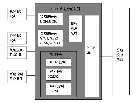 H.323是國(guó)際電信聯(lián)盟(ITU)的一個(gè)標(biāo)準(zhǔn)協(xié)議棧,該協(xié)議棧是一個(gè)有機(jī)的整體,根據(jù)功能可以將其分為四類(lèi)協(xié)議,也就是說(shuō)該協(xié)議從系統(tǒng)的總體框架(H.323)、視頻編解碼(H.263)、音頻編解碼(H.723.1)、系統(tǒng)控制(H.245)、數(shù)據(jù)流的復(fù)用(H.225)等各方面作了比較祥細(xì)的規(guī)定。