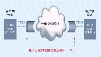 CESoP的基本思想就是在分組交換網(wǎng)絡(luò)上搭建一個(gè)“通道”,在其中實(shí)現(xiàn)TDM電路(如T1或E1),從而使網(wǎng)絡(luò)任一端的TDM設(shè)備不必關(guān)心其所連接的網(wǎng)絡(luò)是否是一個(gè)TDM網(wǎng)絡(luò)。分組交換網(wǎng)絡(luò)被用來(lái)仿真TDM電路的行為,故而稱(chēng)為“電路仿真”(圖1)。