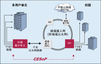 對(duì)于擁有眾多用戶(hù)的樓宇或校園業(yè)務(wù),運(yùn)營(yíng)商可能需要在靠近客戶(hù)的地方裝設(shè)遠(yuǎn)端集中器。遠(yuǎn)端集中器集中提供給該樓宇內(nèi)客戶(hù)的TDM和/或分組業(yè)務(wù),使用電路仿真并通過(guò)點(diǎn)到點(diǎn)連接將業(yè)務(wù)傳回最近的城域網(wǎng)絡(luò)接入點(diǎn)。