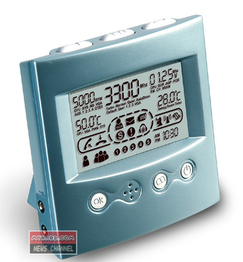 這個裝置,其實是一項早期工具的衍生產(chǎn)品。早在2004年,這個具有獨立顯示屏的小東西被開發(fā)出來,用以控制電腦的超頻設(shè)定并監(jiān)控系統(tǒng)的效能,F(xiàn)在這個在下周起于各大通路都買得到的新機種已納入Skype話務(wù)管理功能,使用者可直接把頭戴式耳機接到這個小時鐘上,one-touch輕輕一按,便可立即進行接通電話、速簡撥號及電話會議。