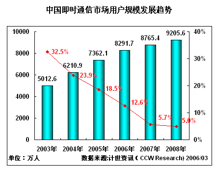 即時(shí)通訊巨大的市場(chǎng)價(jià)值主要來(lái)自三方面,除了能夠增加門戶網(wǎng)站的用戶的黏性,即時(shí)通訊能夠帶來(lái)巨大的用戶和網(wǎng)絡(luò)通訊巨大的市場(chǎng)。根據(jù)計(jì)世資訊《2005-2006年中國(guó)VoIP業(yè)務(wù)發(fā)展趨勢(shì)研究報(bào)告》相關(guān)數(shù)據(jù)顯示,2005年中國(guó)即時(shí)通訊用戶達(dá)到7362.1萬(wàn)人,增長(zhǎng)率為18.5%,2005年中國(guó)即時(shí)通訊市場(chǎng)規(guī)模達(dá)到16.2億元,實(shí)現(xiàn)37.3%的增長(zhǎng)率。