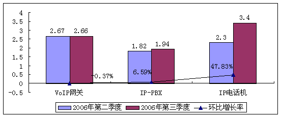2006年國內(nèi)傳統(tǒng)電信運營商已經(jīng)逐步開始進入到NGN及新一代VoIP業(yè)務的實質性網(wǎng)絡建設階段,并且隨著企業(yè)對VoIP理解的加深及控制成本的考慮,大型企業(yè)CIO對VoIP的接納態(tài)度正在向好。在中小型企業(yè)市場,由于企業(yè)對通信成本更加敏感,但受VoIP設備技術成熟及價格下降這些因素的影響,這一市場也在迅速升溫。這些都促使VoIP設備在2006年開始進入實際購買階段,促進了VoIP設備規(guī)模增長。2006年第二季度國內(nèi)VoIP設備市場收入為6.79 億人民幣,與第一季度同比增長率為19.96%,整體市場保持穩(wěn)定增長。從中國VoIP設備產(chǎn)品市場結構(銷售額劃分)來看,VoIP網(wǎng)關占39.2%,IP-PBX占26.9%,IP電話機占33.9%。