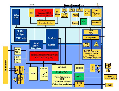 例如,SC14438是一個優(yōu)化了的CMOS芯片,能夠進(jìn)行DECT(1.9GHz)內(nèi)或2.4GHz ISM數(shù)字頻帶手機(jī)內(nèi)需要的所有音頻、信號及數(shù)據(jù)處理。一個ADPCM代碼轉(zhuǎn)換器,一個低功耗的編解碼器(CODEC)及模擬前端被集成于該芯片中,提供麥克風(fēng)與(動態(tài)的)揚聲器之間直接的連接。同時還整合了雙工免提操作。SC14438的設(shè)計適用于任一無線產(chǎn)品設(shè)計。一個專用的TDMA控制器能夠處理所有的物理層時隙和無線控制。美國國家半導(dǎo)體公司的標(biāo)準(zhǔn)小型RISC