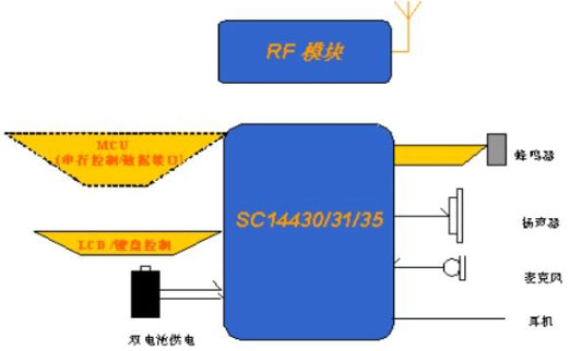 DECT的座機(jī)部分可以根據(jù)應(yīng)用,選擇配置采用獨立模式或外接MCU的模式工作,方便用戶靈活擴(kuò)展功能。外接MCU通過RS232口或SPI口與基帶處理器SC14438/37/35連接,實現(xiàn)控制/數(shù)據(jù)的交互。