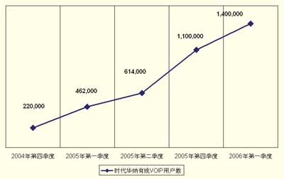 很快時(shí)代華納有線的VoIP業(yè)務(wù)就出現(xiàn)了強(qiáng)勁的增長,2005年的頭幾個(gè)月,其VoIP用戶數(shù)以幾乎每周1萬的速度增加,到2005年第二季度,時(shí)代華納有線就成為全美第二大VoIP提供商。圖1描述了時(shí)代華納有線從2004年到2006年初的VoIP客戶強(qiáng)勁增長。