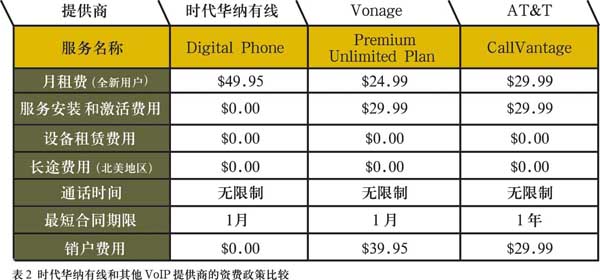 聲稱其1/3的有線電視用戶和一半以上的寬帶用戶訂購了其提供的VoIP服務(wù)。對(duì)于時(shí)代華納有線的全新VoIP用戶來說,開通并使用“數(shù)字電話”的費(fèi)用為每月49.95美元,那些時(shí)代華納有線的寬帶用戶只需44.95美元,如果用戶同時(shí)使用有線電視和寬帶,那么只需要39.95美元就可以了,時(shí)代華納有線為所有的服務(wù)(視頻、語音和數(shù)據(jù)接入)提供每月統(tǒng)一的賬單。此外用戶使用“數(shù)字電話”不需要簽訂長期合同,并享有30天的試用期,相對(duì)于其競爭對(duì)手來說賦予了用戶更多的自由。