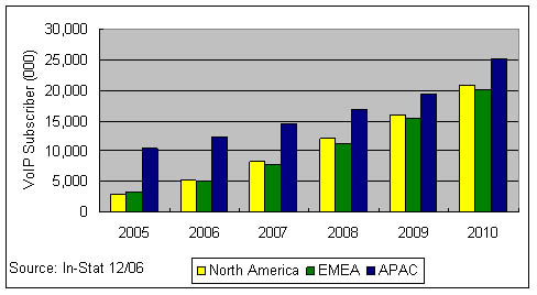 應該說在2006年,VoIP技術(shù)已經(jīng)不是阻礙其市場發(fā)展的主要因素,因為In-Stat在全球個人VoIP消費市場中作的調(diào)查顯示,約9%的VoIP用戶甚至不清楚自己在使用IP傳輸;有64%的用戶在使用免費的VoIP服務。其次有超過73%的用戶并不把是否使用IP技術(shù)當成選擇該業(yè)務的影響因素。而寬帶接入市場的競爭則構(gòu)成了VoIP發(fā)展的關(guān)鍵因素,作為一種寬帶應用,誰的接入資源占據(jù)了用戶家庭,誰就可以決定是否采用VoIP技術(shù)來提供語音業(yè)務。在歐洲法國Free Telecom與意大利的FastWeb都是三重播放業(yè)務的積極推進者,在VoIP市場居領(lǐng)先地位;在日本Yahoo!BB擁有亞洲地區(qū)50%的寬帶VoIP用戶。幾乎所有這些寬帶ISP提供商往往采用包月的形式或者以極低的費用提供無限制的本地或國內(nèi)通話,在國際長途電話上提供極大的折扣。