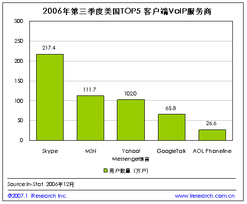iResearch艾瑞市場咨詢根據(jù)In-Stat的統(tǒng)計數(shù)字整理發(fā)現(xiàn),目前在美國VoIP市場中,以客戶端為服務基礎的服務提供商的用戶數(shù)量來看,占市場主導位置的五大服務商為Skype、MSN、Yahoo、Google和AOL.到2006年第三季度為止,Skype的用戶已經達到了217.4萬,排名第五位AOL Phoneline的用戶數(shù)量也有26.6萬之多。
