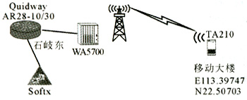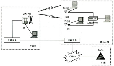 組網(wǎng)時(shí),由于BS(石岐東)需要與廣州的SoftX連接,因此,實(shí)際組網(wǎng)方案通過傳輸設(shè)備連接公安局與移動(dòng)大廈;然后通過移動(dòng)大廈的CMNet網(wǎng)絡(luò)連接廣州的SoftX。在該個(gè)組網(wǎng)中,視距傳播環(huán)境通過固定在移動(dòng)大樓支架上的遠(yuǎn)端站實(shí)現(xiàn),非視距傳播環(huán)境通過移動(dòng)的遠(yuǎn)端站實(shí)現(xiàn)。