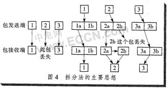 如果某個RTP包在傳輸過程中丟失,那么丟失的只是原數(shù)據(jù)包按采樣間隔的一半信息,接收端可以用接受到的另一半信息,利用插值等方法恢復出原話音包的大部分信息,從而使話音質(zhì)量不至于下降太多。拆分法的主要思想如圖4所示。