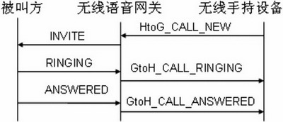 當用戶通過無線手持設備撥打一個號碼時,無線手持設備將發(fā)送一個HtoG_CALL_ NEW的內部會話信令連同呼叫的號碼給無線語音網關,無線語音網關收到該信令后,將根據該信令構造相應的SIP消息并發(fā)送到外部網絡。當無線語音網關收到來自被叫方表示振鈴信息的暫時應答RINGING時,將發(fā)送一個GtoH_CALL_RINGING的內部會話信令給手持設備。當無線語音網關收到來自被叫方表示應答的信息ANSWERED時,語音網關將啟動RTP線程并發(fā)送一個GtoH_CALL_ANSWERED的內部會話信令給手持設備以通知被叫方已應答。此時手持設備開啟語音進程,與被叫方實現通話。