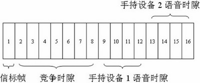 根據設計的特點,無線語音網關同手持設備間的無線網絡采用星型拓撲結構,無線語音網關作為無線個域網的協調器同手持設備進行信息交互。IEEE802.15.4MAC層分為使用信標幀和不使用信標幀兩種工作模式,本設計采用使用信標幀同步的超幀結構,由無線語音網關發(fā)送信標幀同步無線手持設備的數據傳輸。本設計中超幀長30ms,等分為16個時隙,每個時隙為1.875ms。信標幀在時隙1發(fā)送,時隙2到時隙8為競爭時隙,使用時隙CSMA-CA算法傳輸命令幀和應答幀。時隙9到時隙16固定分配給兩個手持設備作為上下行語音數據通道。上下行各兩個時隙的分配可以滿足經