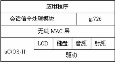 操作系統之上是無線MAC層,該模塊針對語音無線傳輸的特點簡化實現了IEEE 802.15.4 協議MAC層功能。第三層為語音壓縮編解碼g.726模塊和無線網內部會話信令處理模塊。會話信令處理模塊負責處理來自無線語音網關的會話信令。最上層為應用層,實現用戶界面和通話過程控制。無線手持設備總統框架如圖6所示。
