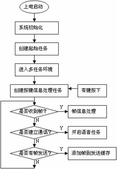 當手持設備上電啟動后,其工作流程如圖7示。首先進行的是系統的初始化,包括處理器初始化,操作系統mC/OS-II初始化,LCD,鍵盤,射頻模塊等的初始化。之后建立起始任務并通過OSStart()函數進入多任務環(huán)境。此時起始任務占用CPU資源,在起始任務中,建立按鍵信息處理任務并通過信號量機制掛起。然后判斷是否收到來自無線語音網關的幀,如果有,調用frame_deal()函數處理幀信息,在該函數中調用call_command_deal()完成無線網內部會話信令的處理。接著判斷通話是否建立,如果建立則創(chuàng)建語音任務,在語音進程中使能PCM編解碼芯片,并進行g.726壓縮編碼。最后判斷是否有幀需要發(fā)送給無線語音網關,如果有則把幀添加到發(fā)送緩存,等待發(fā)送時隙到來。這一過程完成以后重新跳到判斷是否收到來自無線語音網關的幀,重復以上過程。如果有鍵盤中斷,將會釋放一個信號量,該信號量將解掛按鍵信息處理任務。該任務對鍵盤輸入信息進行處理。