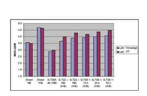 圖2對MOS(平均意見得分)值的分析深刻說明了寬帶是如何被主觀感知的。窄帶G.729A的多數(shù)MOS值約為 3.5,而高清語音的MOS值至少比其高出30%,達到4.5。