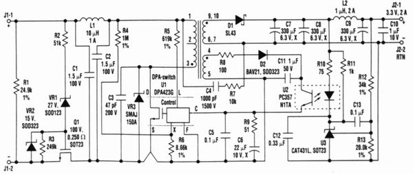整個(gè)電源效率為78%,這樣1個(gè)簡(jiǎn)單的反激電源能提供3.3V(2A)。對(duì)大多數(shù)應(yīng)用來講,低成本和簡(jiǎn)單化是最重要的特性。假若采用同步整流正激轉(zhuǎn)換器拓?fù)浜途哂休^低通導(dǎo)功耗、較高功率的器件DPA424G,則電路效率可增加5%~10%。