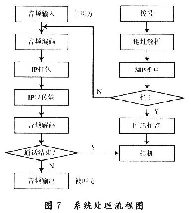 當(dāng)撥號(hào)確認(rèn)后,主控制器對(duì)編解碼器發(fā)送控制指令,開始語(yǔ)音A/D轉(zhuǎn)換,并進(jìn)行編碼,送到片外存儲(chǔ)器內(nèi)進(jìn)行緩存;Nios CPU對(duì)撥號(hào)信息的解析確定。目的地址,通過Avalon總線對(duì)以太網(wǎng)接口發(fā)送數(shù)據(jù)傳輸指令;將符合以太網(wǎng)標(biāo)準(zhǔn)的數(shù)據(jù)從片外存儲(chǔ)器內(nèi)讀出,送入Internet中,返回確認(rèn)信息。系統(tǒng)處理流程圖如圖7所示。