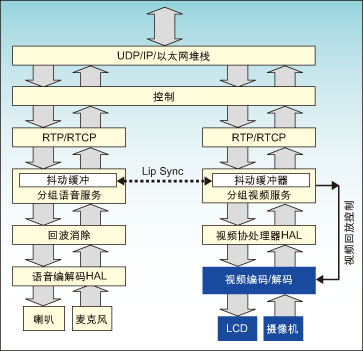 盡管同步并不是一個(gè)很大的運(yùn)算負(fù)擔(dān),但同步算法和實(shí)現(xiàn),包括抖動(dòng)緩沖管理,都需要特別小心方可達(dá)到預(yù)期的結(jié)果。有效的方法是,將該處理與總的系統(tǒng)控制和編解碼處理管理緊密地協(xié)調(diào)。一種最好的方案是將同步處理放在實(shí)現(xiàn)更高級(jí)功能的系統(tǒng)通用主CPU上來實(shí)現(xiàn)。