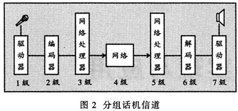 ——無(wú)論對(duì)于實(shí)時(shí)的應(yīng)用(如IP電話)還是非實(shí)時(shí)的應(yīng)用(如語(yǔ)音郵件),發(fā)送端語(yǔ)音都要經(jīng)過(guò)模擬信號(hào)—數(shù)字信號(hào)—語(yǔ)音包的處理過(guò)程,并在接收端對(duì)語(yǔ)音包進(jìn)行相反的處理,從而得到與輸入端相同的語(yǔ)音信號(hào)。由圖2可見(jiàn),每個(gè)語(yǔ)音流從信源(話筒)到信宿(揚(yáng)聲器)就像通過(guò)一條管道,這條管道包括許多級(jí),每一級(jí)代表一些特有的語(yǔ)音包處理過(guò)程。