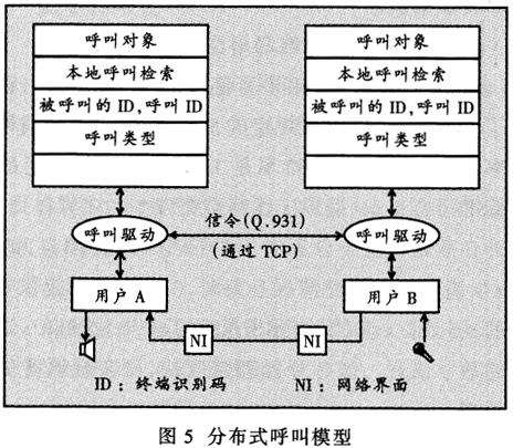 ——IP電話采用分布式的呼叫模式。因?yàn)椴恍枰ㄟ^(guò)電路交換完成呼叫,所以每個(gè)終端都使用了呼叫處理器。單工呼叫模式僅支持一個(gè)終端的呼叫,且需要本地呼叫驅(qū)動(dòng)的支持。通過(guò)觸發(fā)本地呼叫驅(qū)動(dòng)軟件建立一次呼叫,而呼叫驅(qū)動(dòng)利用傳輸控制協(xié)議(TCP)的套接字(Socket)與另一端的呼叫驅(qū)動(dòng)建立信令連接,從而觸發(fā)另一端的單工呼叫。這兩個(gè)單工呼叫被觸發(fā)后按照Q.931信令協(xié)議完成呼叫過(guò)程的建立。根據(jù)信令的引導(dǎo),呼叫驅(qū)動(dòng)程序啟動(dòng)語(yǔ)音信息流接入網(wǎng)絡(luò)和對(duì)端的接收設(shè)備,建立一個(gè)完整的呼叫過(guò)程(圖5)。圖5中的呼叫對(duì)象指明本次呼叫的域名、兩端的終端識(shí)別碼(ID)或電話號(hào)碼、呼叫類型(如單純語(yǔ)音、語(yǔ)音和數(shù)據(jù))等信息。