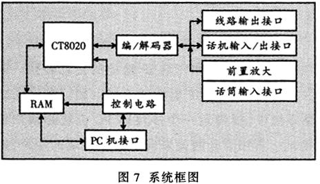 ——硬件平臺(tái)構(gòu)造于PC機(jī)上,采用ISA總線插卡方式,如圖7所示。該平臺(tái)采用了美國(guó)DSPG公司的專用數(shù)字信號(hào)處理器CT8020作為核心部件,利用先進(jìn)的可編程邏輯器件開發(fā)了外圍控制電路和接口電路。它主要完成以下功能。