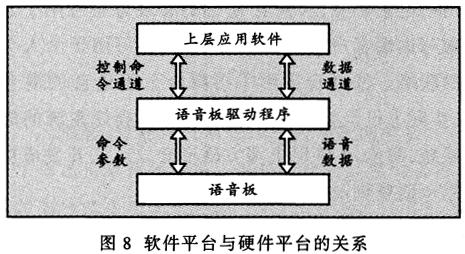 ——為便于在Windows95環(huán)境下使用該平臺(tái),開發(fā)了虛擬設(shè)備驅(qū)動(dòng)程序。該程序?yàn)樯蠈榆浖峁┝素S富的接口函數(shù),用于實(shí)現(xiàn)對(duì)語(yǔ)音板的操作。軟件平臺(tái)與硬件平臺(tái)的關(guān)系如圖8所示。