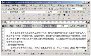 在安裝了語(yǔ)音識(shí)別功能后,如果你設(shè)置顯示語(yǔ)言欄,那么你將會(huì)在Office程序中看到如圖14所示的麥克風(fēng)圖標(biāo)(如果未看到,請(qǐng)從"工具"菜單中選中"語(yǔ)音"項(xiàng)),工作時(shí)將在"聽寫"和"聲音命令"模式之間進(jìn)行切換。