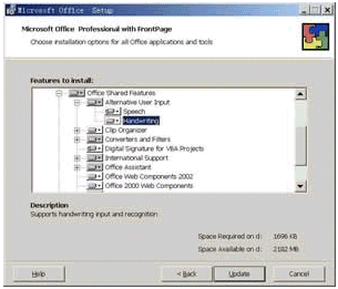 如果是首次使用手寫識(shí)別,那么需要通過執(zhí)行自定義安裝來安裝本功能。注意無(wú)法從"工具"中找到類似"語(yǔ)音"的"手寫"命令,你只能通過插入Office XP光盤的方法進(jìn)行自定義安裝,其安裝步驟與安裝自定義安裝語(yǔ)音識(shí)別功能一致,不過這次是從"Office 共享功能"旁,單擊"中文可選用戶輸入方式"旁,單擊"手寫輸入"(如圖15所示)。
