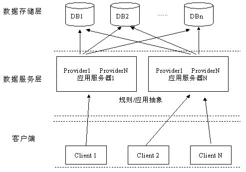 在大規(guī)模系統(tǒng)中,為保證數(shù)據(jù)庫訪問的效率和安全性,數(shù)據(jù)訪問方式一般采用由Client、中間層應用服務器(或叫規(guī)則服務器)和Server組成的三層Client/Server結構。將數(shù)據(jù)庫應用劃分為邏輯上的三個層次,客戶程序只關心數(shù)據(jù)的顯示與用戶界面;應用服務器處理客戶數(shù)據(jù)查詢與更新請求,可在應用服務器上定義數(shù)據(jù)操作規(guī)則以保證數(shù)據(jù)操作的合法性、安全性與有效性。在三層結構下,方便了軟件的修改和模塊的疊加,客戶端通過應用服務器訪問數(shù)據(jù)庫服務器,客戶端并不直接與數(shù)據(jù)庫服務器建立連接,從而減輕了數(shù)據(jù)庫服務器的壓力,提高整個應用系統(tǒng)的運行效率。