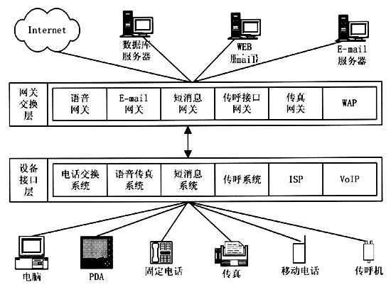 統(tǒng)一消息平臺(tái)集成了固定電話網(wǎng)、移動(dòng)電話網(wǎng)和Internet網(wǎng)絡(luò)。目前,電話網(wǎng)和Internet網(wǎng)各自擁有獨(dú)立的網(wǎng)絡(luò)資源和信息服務(wù)領(lǐng)域,而這兩大網(wǎng)絡(luò)的用戶群存在著很大的交叉。電話的使用在中國已經(jīng)占有很高的普及率,傳統(tǒng)的160/168聲訊服務(wù)已經(jīng)成為中國百姓所熟悉的最具代表性的電話信息服務(wù),而Internet作為在中國剛剛興起的信息媒體,尚需要普通百姓逐漸認(rèn)識(shí)它、使用它。統(tǒng)一消息平臺(tái)將電話網(wǎng)和Internet網(wǎng)結(jié)合在一起,極大地?cái)U(kuò)大了兩大網(wǎng)絡(luò)各自的用戶群,電話用戶可以用電話或者傳真獲取Internet上的信息,電子郵件服務(wù)也可以不局限于Internet,而能對(duì)廣大的電話用戶開放。統(tǒng)一消息平臺(tái)為用戶帶來的是信息的方便、及時(shí),使人們在任何時(shí)間、任何地點(diǎn)都能夠獲取需要的信息。