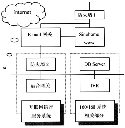160/168聲訊平臺(tái)通過炎黃新星的網(wǎng)關(guān)產(chǎn)品與Internet相聯(lián),為了保證原有聲訊系統(tǒng)的安全性,在炎黃新星多終端信息訪問平臺(tái)的網(wǎng)絡(luò)結(jié)構(gòu)中增加了防火墻設(shè)置,原有的160/168聲訊平臺(tái)置于防火墻的后端,只與炎黃新星的語音合成網(wǎng)關(guān)存在通信聯(lián)系。