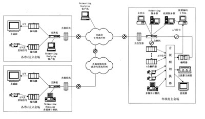 由于政府部門(mén)所跨的地域較廣,彼此之間的距離較遠(yuǎn),而且各級(jí)政府部門(mén)的會(huì)議較多,因此,利用修建好的信息高速公路建立一個(gè)基于IP網(wǎng)絡(luò)的視像會(huì)議系統(tǒng)具有一定的實(shí)用價(jià)值。這種系統(tǒng)既可以提高政府部門(mén)的辦公效率以及政府專(zhuān)用網(wǎng)絡(luò)的利用率,又可以節(jié)省政府部門(mén)的會(huì)議費(fèi)用。以下介紹在IP寬帶網(wǎng)上構(gòu)建電視電話(huà)會(huì)議系統(tǒng)解決方案。
