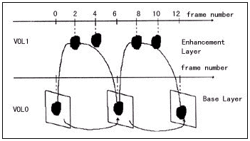 時域可擴展性編碼通常是通過在碼流中添加B幀來實現(xiàn)的。B幀是使用與它在時間上最近鄰的前后兩個I幀或P幀來預測的,而自己并不作為任何其它幀的參考圖像,因此在傳輸中丟棄B幀并不影響其它幀的質(zhì)量,而僅僅降低幀率。圖1是MPEG-4的時域可擴展性編碼的示意圖。